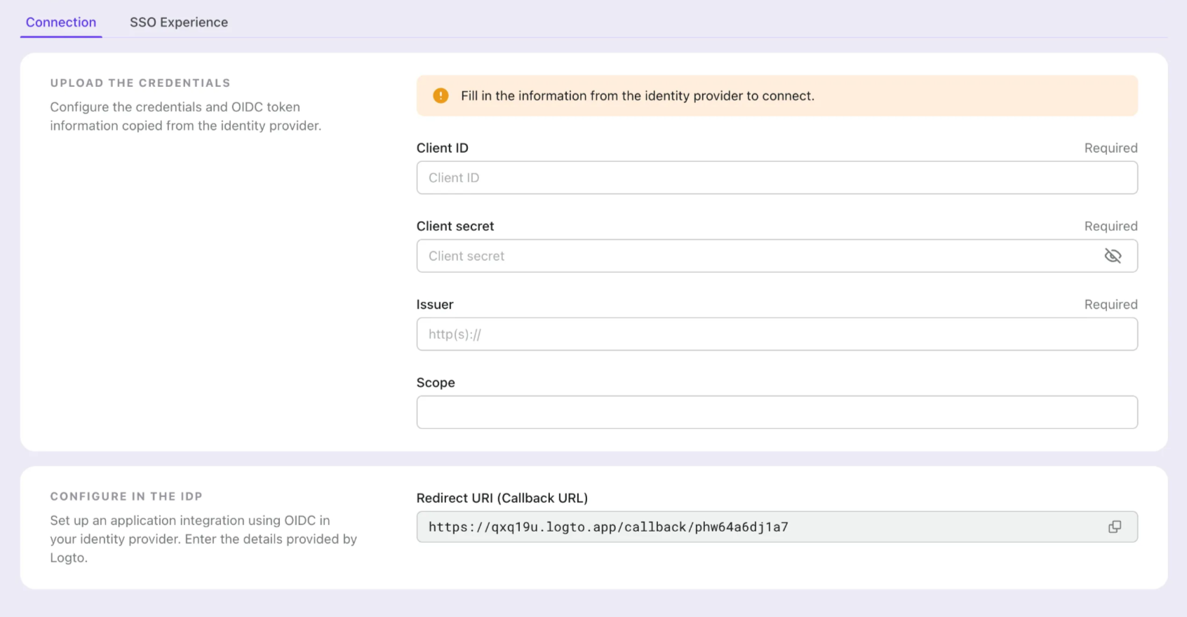 1. Configure the connection with your IdP in the "Connection" tab. Check the guides above for each connector types.